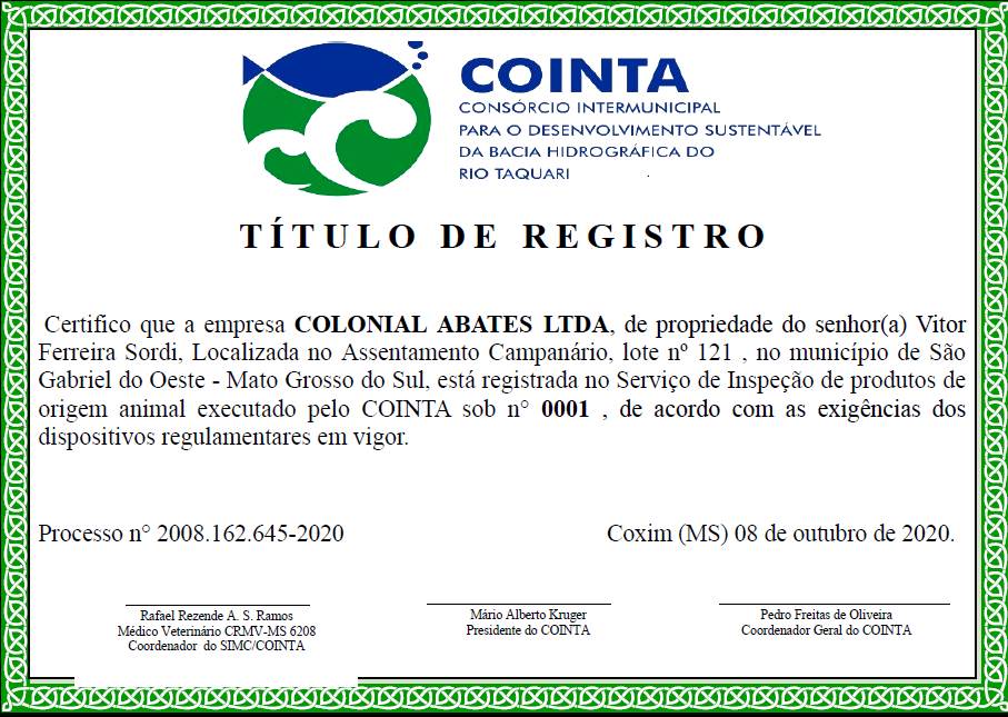 O Serviço de Inspeção de Produtos de Origem Animal executado pelo Consórcio Intermunicipal para o Desenvolvimento Sustentável da Bacia hidrográfica do Rio Taquari – SIMC-COINTA, amparado pela legislação aplicável, realizou a instalação do SIMC-COINTA sob o número 0001 no estabelecimento COLONIAL ABATES LTDA, objeto do processo 2008.162.645-2020, classificação Abatedouro Frigorífico–Suínos. Localizada no Assentamento Campanário, Lote 121, no município de São Gabriel do Oeste-MS.
