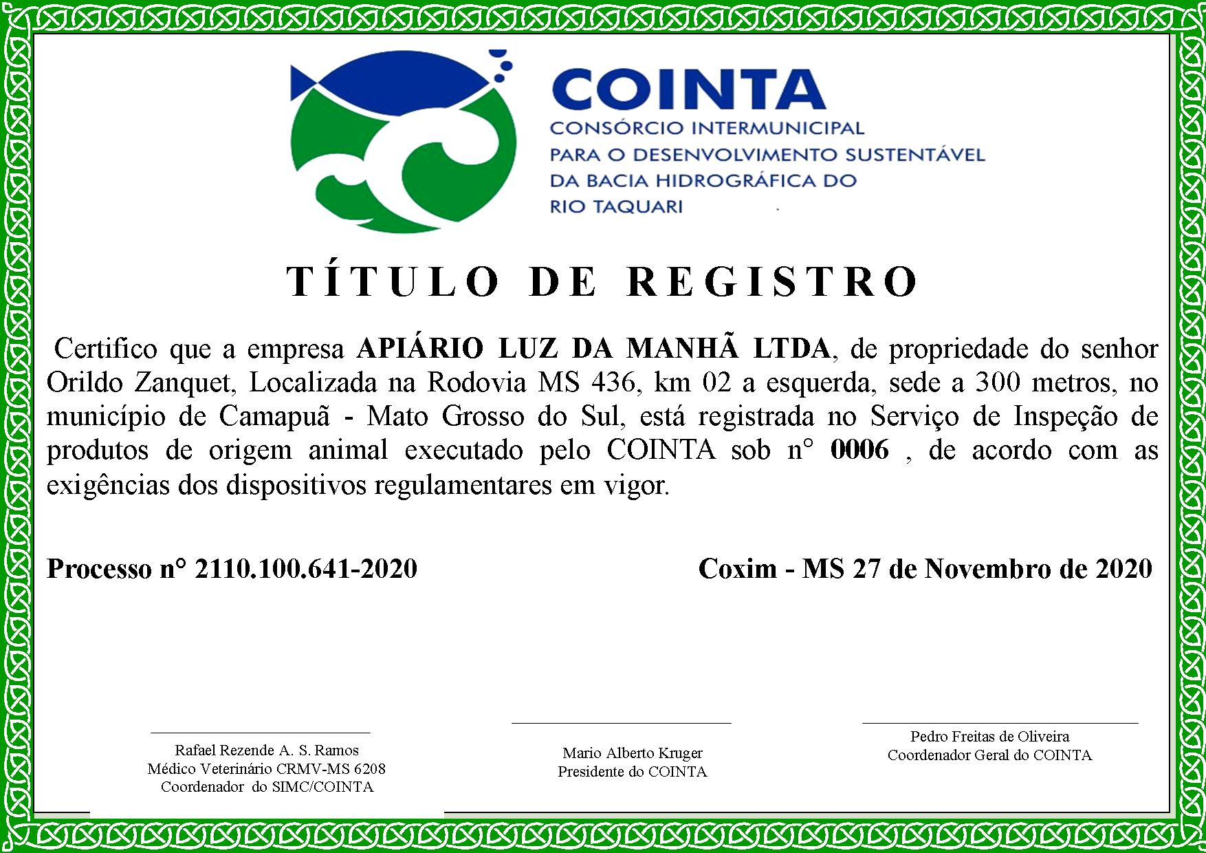 O Serviço de Inspeção de Produtos de Origem Animal Executado pelo COINTA, amparado pela legislação aplicável, registrado no SIMC-COINTA sob o número 0006 o estabelecimento APIÁRIO LUZ DA MANHÃ LTDA, de propriedade do senhor Orildo Zanquet e outros, objeto do processo 2110.100.641-2020, Localizada na Rodovia MS 436, km 02 a esquerda, sede a 300 metros, no município de Camapuã – MS. Na oportunidade, a Médica Veterinária Coordenadora em exercício do SIMC-COINTA e fiscal do SIPOA da unidade descentralizada de Paraíso das Águas, Vanessa Paulino Matheus, acompanhada do Coordenador Geral do COINTA o sr. Pedro Freitas de Oliveira e do Biólogo Cleiton Oliveira dos Santos Mestre em Saneamento Ambiental realizaram a entrega do título de registro juntamente com o Secretário Municipal de Agronegócio, Meio Ambiente e Empreendedorismo do município de Camapuã – MS, sr. Antonio Giovani Diniz da Rocha, e sua Assessora Tereza Vicencia de Araujo.