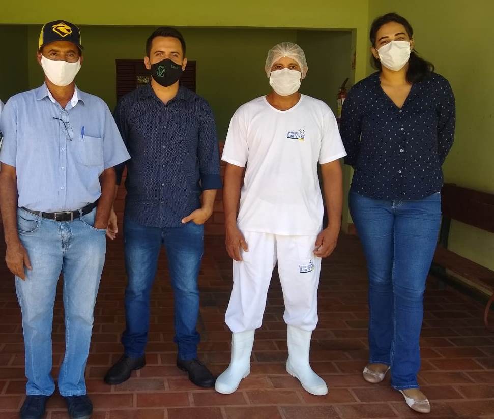Da esq. para direita, Pedro Freitas de Oliveira, coordenador geral do Cointa, Médico Veterinário Rafael Rezende, coordenador do SIMC-COINTA, senhor Gilvan, proprietário da fábrica de laticínios Boa Vista e a fiscal da unidade de Pedro Gomes, Médica veterinária Angélica Sabeh