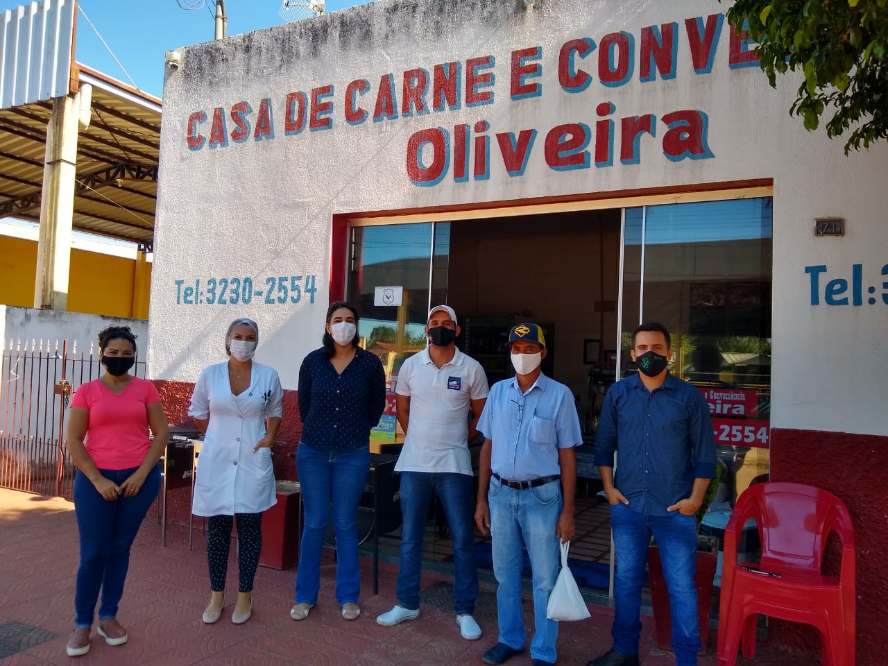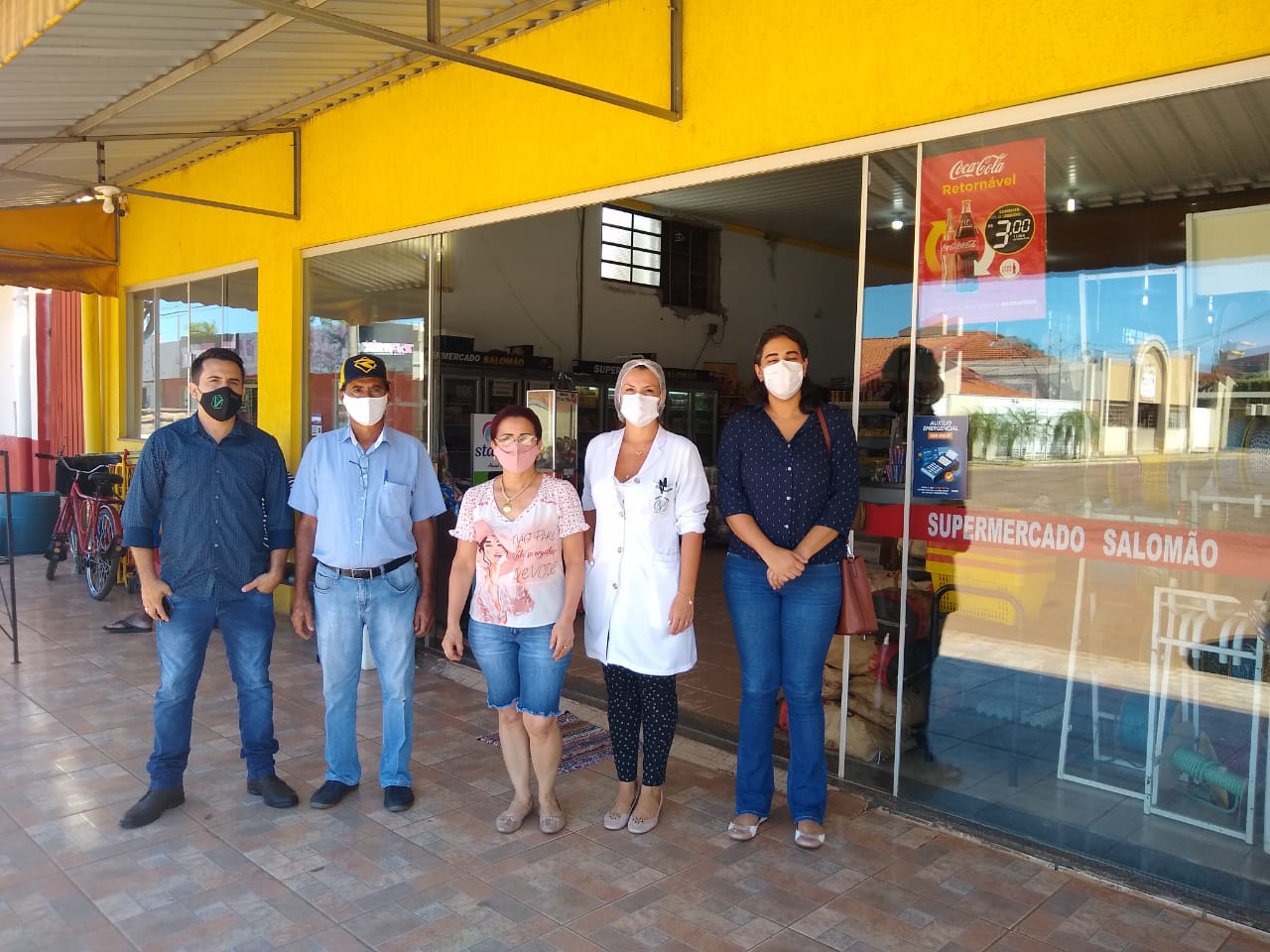 Da esq. para direita, o Médico Veterinário Rafael Rezende, coordenador do SIMC-COINTA, o coordenador geral do COINTA, senhor Pedro Freitas de oliveira, a proprietária do estabelecimento Supermercado Salomão, Senhora Azinete Salomão, a Médica veterinária responsável técnica pelo estabelecimento Tatiana Gomes e a fiscal da unidade de Pedro Gomes, a médica veterinária Angelica Sabeh.