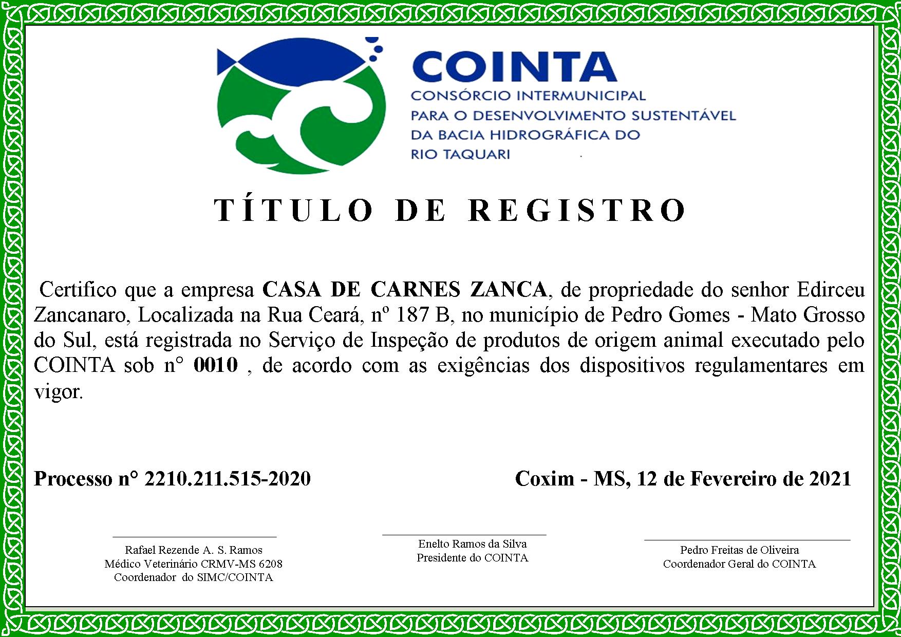 O Serviço de Inspeção de Produtos de Origem Animal Executado pelo COINTA, amparado pela legislação aplicável, realizou a instalação do SIMC-COINTA sob o número 0010 no estabelecimento EMPÓRIO ZANCA CARNES ESPECIAIS, de propriedade de propriedade do senhor Edirceu Zancanaro, objeto do processo 2210.211.515-2020, Localizada na Rua Ceará, nº 187 B, no município de Pedro Gomes – MS. Com o registro no serviço de inspeção executado via consórcio o senhor Edirceu Zancanaro, passou a ter a possibilidade de comercializar legalmente seus produtos dentro do município de Pedro Gomes e nos demais integrantes do consórcio, Alcinópolis, Bandeirantes, Camapuã, Costa Rica, Coxim, Figueirão, Paraíso das Águas, Pedro Gomes, Rio Negro, Rio Verde de Mato Grosso, São Gabriel do Oeste e Sonora, ampliando seu campo de comércio para aproximadamente 170.000 pessoas.