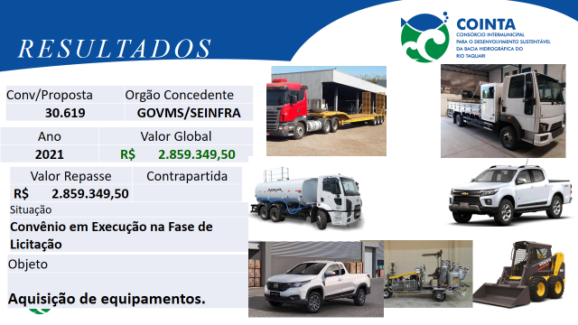 Convênio de quase três milhões de reais firmado com o Estado através da SEINFRA para ampliar a capacidade de atendimento do COINTA aos municípios consorciados. Fruto da participação do Secretário Eduardo Riedel na Assembleia Extraordinária do dia 10 de junho deste ano.