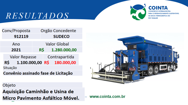 Convênio de mais de um milhão de reais firmado com a SUDECO através da articulação da Ministra Tereza Cristina para aquisição da segunda usina móvel de Micro pavimento Asfáltico que já está sendo licitada pelo COINTA.